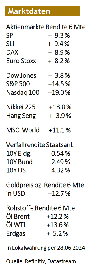 Nach den überraschend starken Gewinnausweisen im ersten Quartal haben die Analysten auch ihre Gewinnschätzungen für den breiten US-Börsenindex S&P 500 für das Gesamtjahr 2024 und 2025 nach oben revidiert. In der Folge konnte auch der US-Markt bis heute eine positive Jahresperformance von 14.5 Prozent verbuchen. Allerdings entfällt ein stattlicher Teil dieses Gewinnes auf wenige grosse Technologieunternehmen, deren Aktienkurse durch überzeugende Gewinnausweise und dem zurückgekehrten Risikoappetit der Anleger stark gestiegen sind.